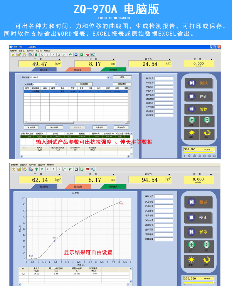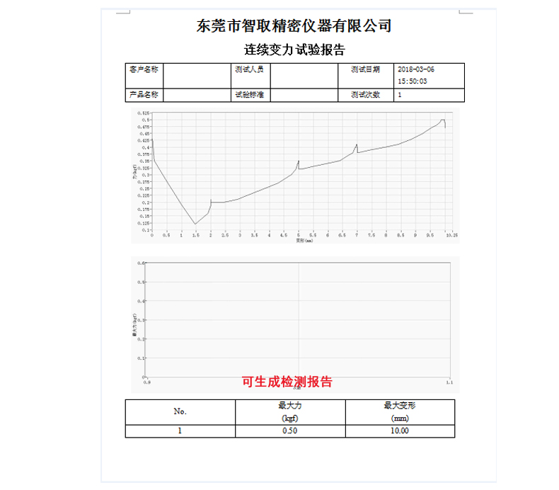 2.配有強(qiáng)大的數(shù)據(jù)處理軟件,通過數(shù)據(jù)線同電腦連接,實現(xiàn)在電腦上控制機(jī)器。在電腦上可出各種力和時間、力和位移的曲線圖,生成檢測報告,可打印或保存。同時軟件支持輸出word報表、Excel報表或原始數(shù)據(jù)Excel輸出。方便客戶做更深入的數(shù)據(jù)處理。