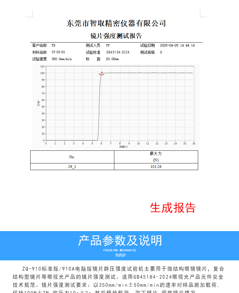 關(guān)鍵詞:眼視光鏡片,靜強度試驗機,玻璃壓克力,近視鏡片,眼睛片試驗