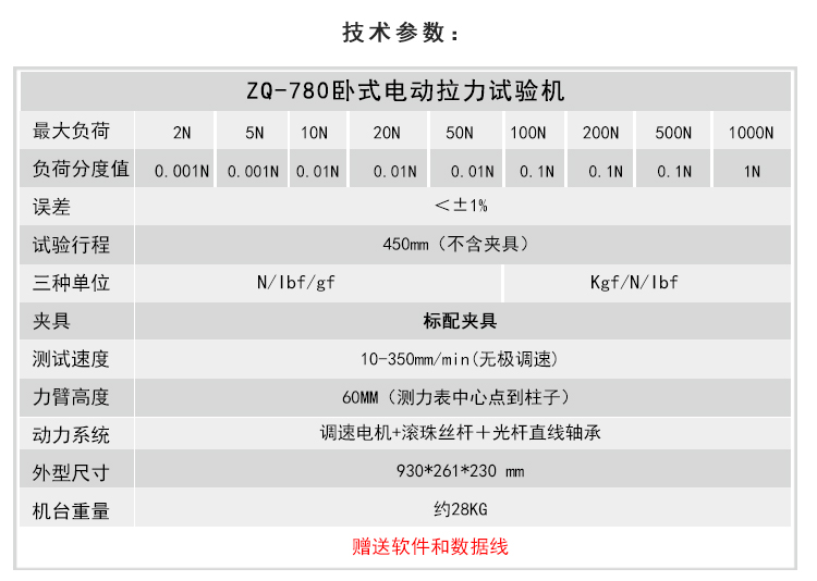 ZQ-780系列臥式拉力試驗(yàn)機(jī),采用電動(dòng)試驗(yàn)機(jī)+測(cè)力表的設(shè)計(jì),大大方便客戶的選擇。通過(guò)選擇不同量程的測(cè)力表,來(lái)滿足各種力值的測(cè)試要求。機(jī)臺(tái)采用全新設(shè)計(jì),外型優(yōu)美。動(dòng)力系統(tǒng)采用調(diào)速電機(jī)+滾珠絲桿+光桿直線軸承,具有體積小、結(jié)構(gòu)緊湊、穩(wěn)定性好、噪音低、操作方便等優(yōu)點(diǎn)。功能上可通過(guò)調(diào)速開關(guān)控制測(cè)試速度的快慢,同時(shí)具有手動(dòng)測(cè)試和自動(dòng)測(cè)試兩種測(cè)試功能,通過(guò)機(jī)器上的限位開關(guān)可實(shí)現(xiàn)到位停機(jī)等功能。試驗(yàn)機(jī)選配上不同的夾具可實(shí)現(xiàn)拉力、壓力、剝離、刺破等力學(xué)試驗(yàn)。機(jī)器廣泛應(yīng)用在工廠、高院校、科研機(jī)構(gòu)、技術(shù)監(jiān)督、質(zhì)檢站所等部門。