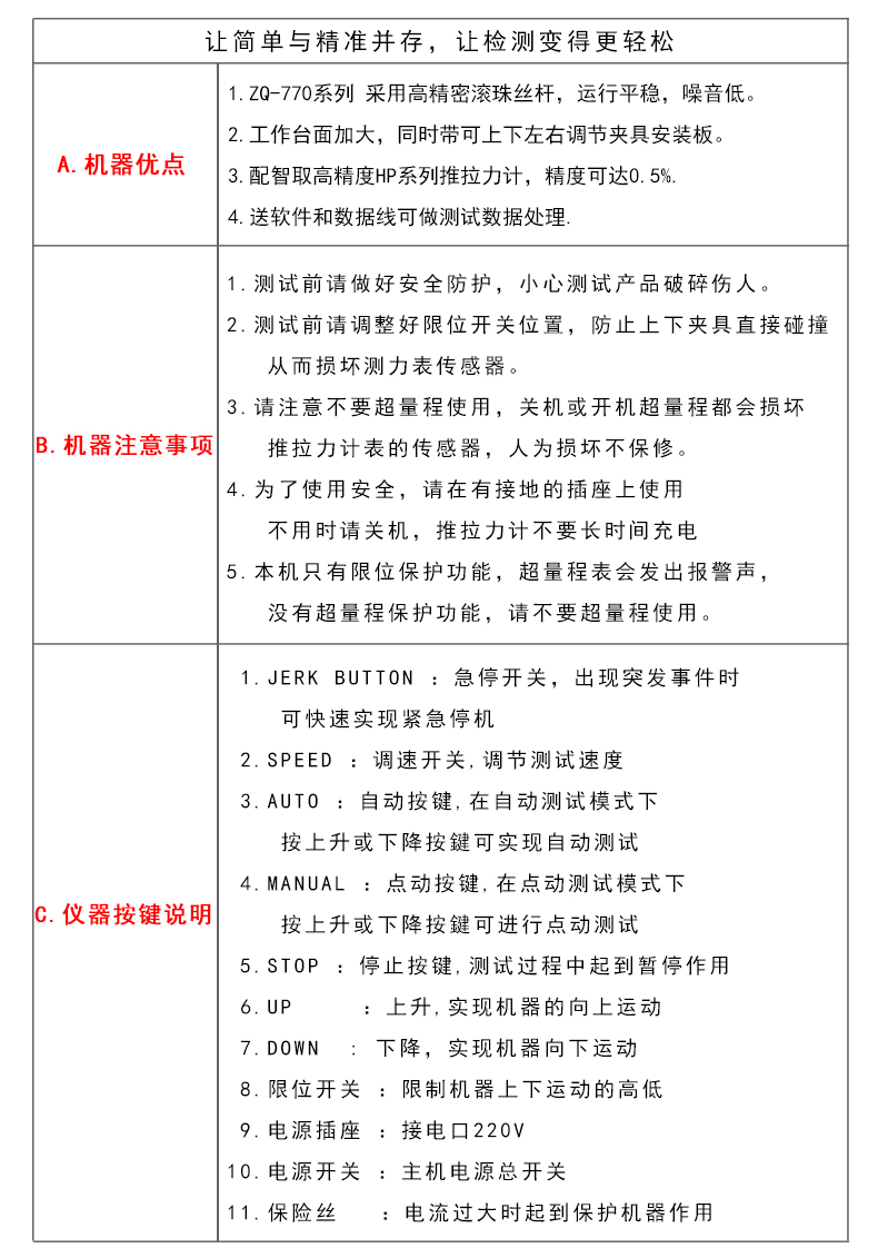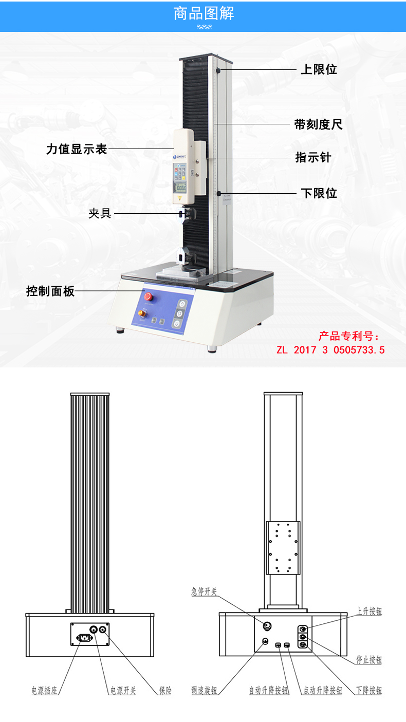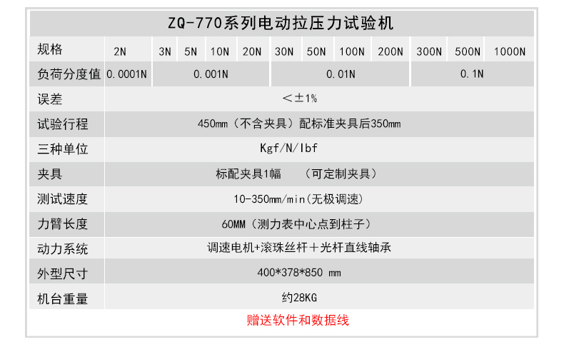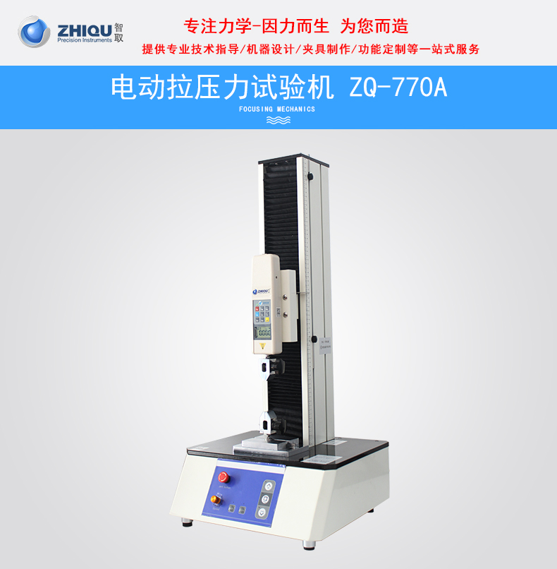 ZQ-770A系列拉力試驗機,采用電動試驗機+測力表的設(shè)計,大大方便客戶的選擇。通過選擇不同量程的測力表,來滿足各種力值的測試要求。機臺采用全新設(shè)計,外型優(yōu)美。動力系統(tǒng)采用調(diào)速電機+滾珠絲桿+光桿直線軸承,具有體積小、結(jié)構(gòu)緊湊、穩(wěn)定性好、噪音低、操作方便等優(yōu)點。功能上可通過調(diào)速開關(guān)控制測試速度的快慢,同時具有手動測試和自動測試兩種測試功能,通過機器上的限位開關(guān)可實現(xiàn)到位停機等功能。試驗機配上不同的夾具可實現(xiàn)拉力、壓力、彎曲、剝離、剪切、撕裂、刺破等力學(xué)試驗。機器廣泛應(yīng)用在工廠、高院校、科研機構(gòu)、技術(shù)監(jiān)督、質(zhì)檢站所等部門。
