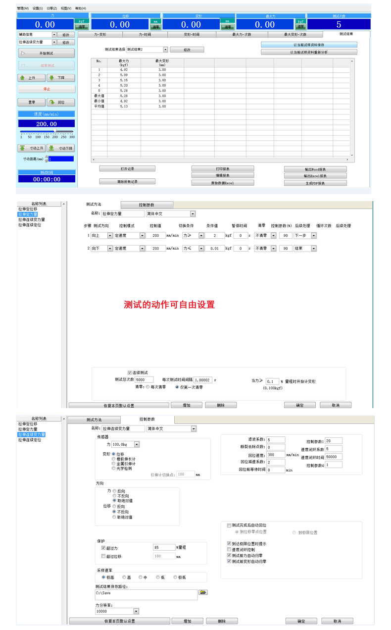2.配有強(qiáng)大的數(shù)據(jù)處理軟件,通過數(shù)據(jù)線同電腦連接,實(shí)現(xiàn)在電腦上控制機(jī)器。在電腦上可出各種力和時(shí)間、力和位移的曲線圖,生成檢測報(bào)告,可打印或保存。同時(shí)軟件支持輸出word報(bào)表、Excel報(bào)表或原始數(shù)據(jù)Excel輸出。方便客戶做更深入的數(shù)據(jù)處理。
