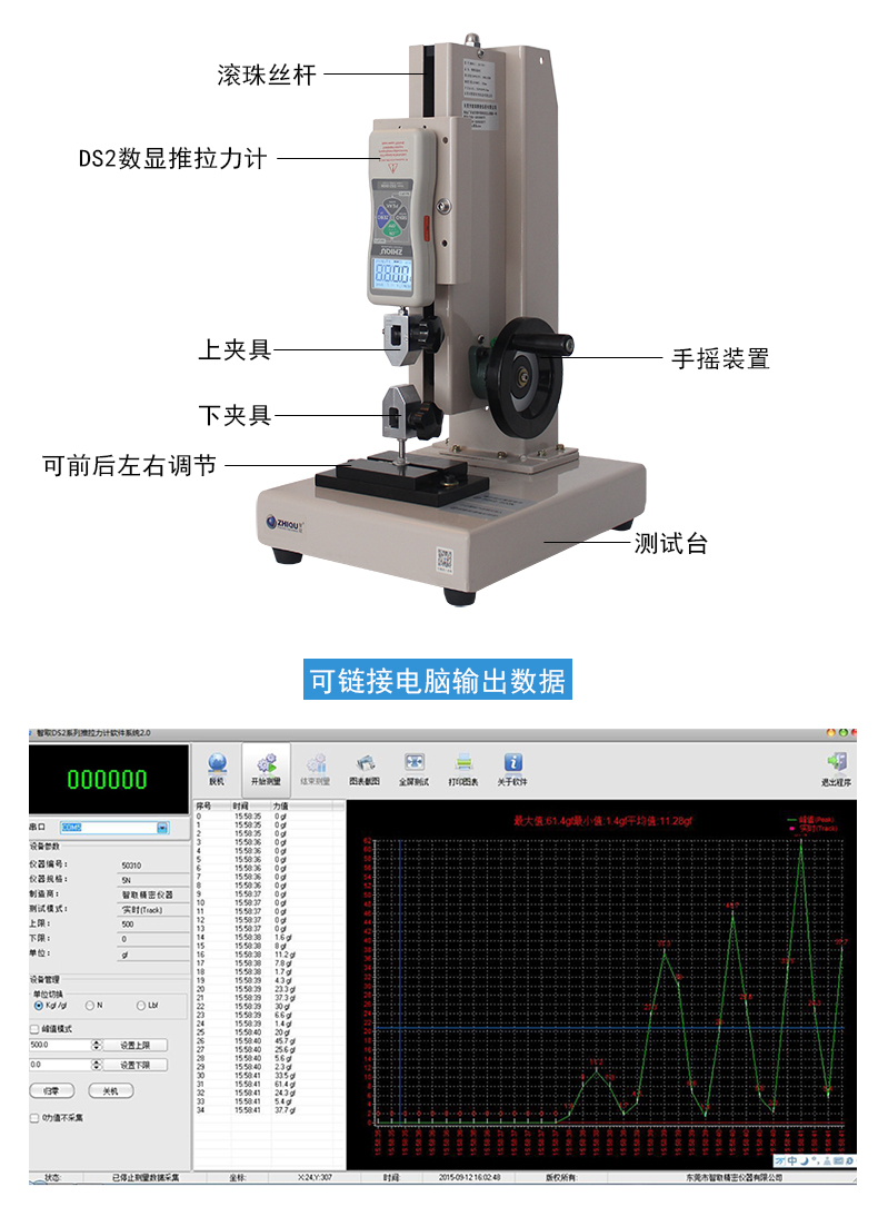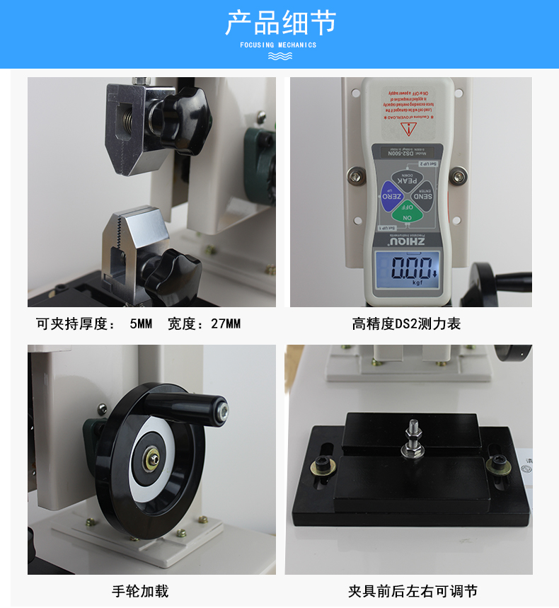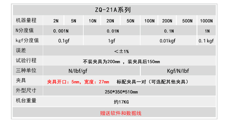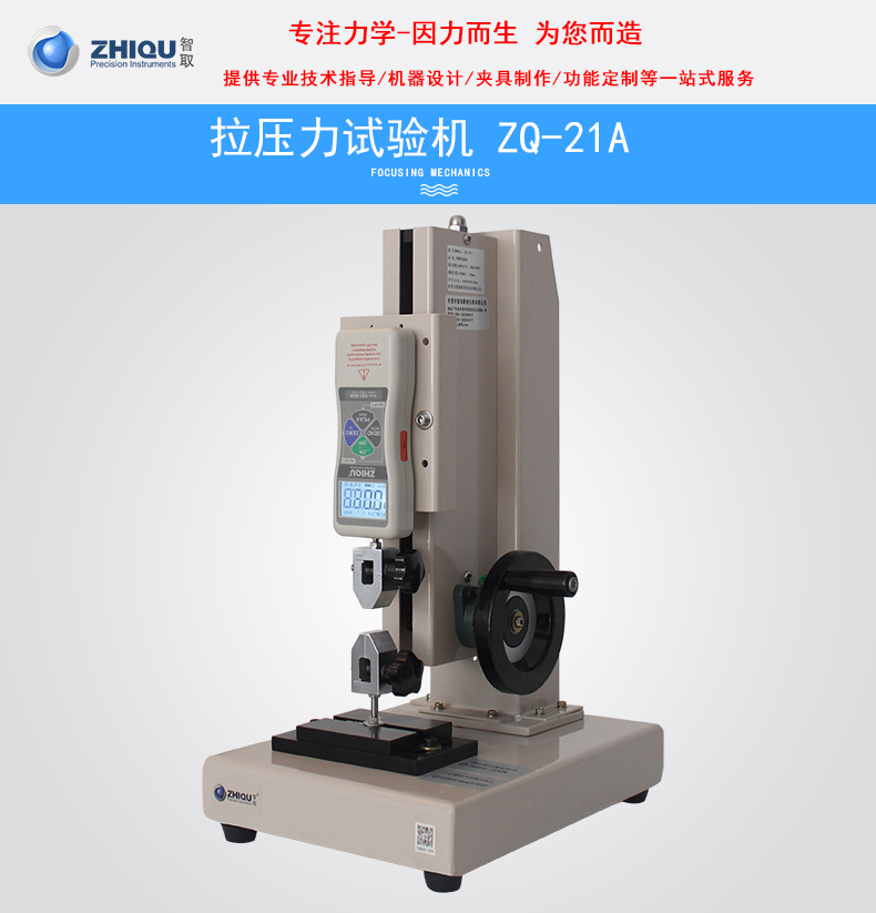 智取ZQ-21A拉壓力試驗機該儀器機械部份采用全封閉結(jié)構(gòu)。機械傳動系統(tǒng)采用高精度滾珠絲桿與雙直線光桿,轉(zhuǎn)動間隙極小,大大提高測試的精密度。測試時轉(zhuǎn)動手輪使推拉力計上下運動,以實現(xiàn)對測試產(chǎn)品的拉伸或壓縮試驗。手輪部份采用杠桿原理設(shè)計,使用起來更輕便省力。力傳感器部份采用智取品牌一代DS2系列推拉力計。誤差可控制在0.5%左右,采樣速率可達1000次/秒,同時配送軟件和USB數(shù)據(jù)線,可同步把數(shù)據(jù)傳送到電腦,進行數(shù)據(jù)保存。 通過轉(zhuǎn)換不同夾具可進行,拉伸、壓縮、彎曲、剝離、剪切、撕裂、刺破、等試驗。儀器具有體積小、結(jié)構(gòu)緊湊、穩(wěn)定性高、使用方便等優(yōu)點長期受到廣大用戶的喜愛。(可選配精度0.01MM的位移標尺,可以實現(xiàn)力和位移的同步變化,實時顯示拉力或壓力同位移的變化)