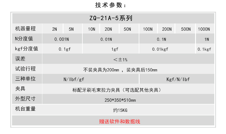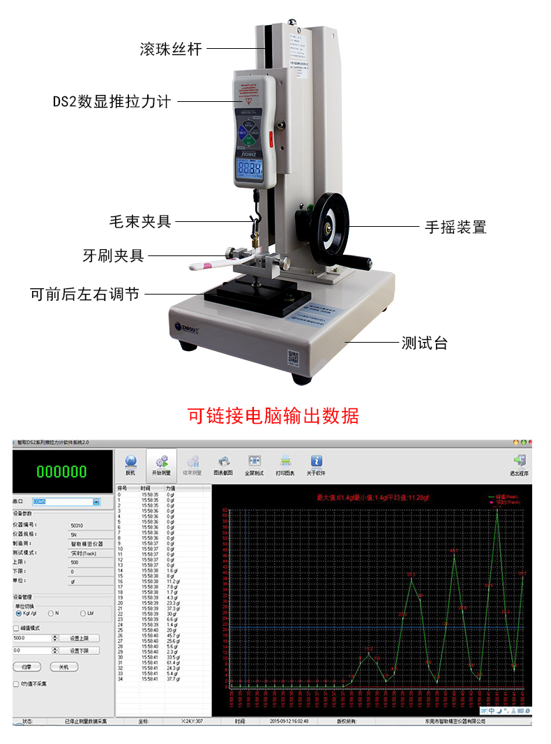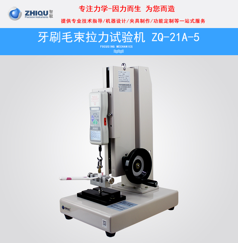 智取ZQ-21A-5牙刷毛束拉力試驗(yàn)機(jī)該儀器機(jī)械部份采用全封閉結(jié)構(gòu)。機(jī)械傳動系統(tǒng)采用高精度滾珠絲桿與雙直線光桿,轉(zhuǎn)動間隙極小,大大提高測試的精密度。測試時(shí)轉(zhuǎn)動手輪使推拉力計(jì)上下運(yùn)動,以實(shí)現(xiàn)對測試產(chǎn)品的拉伸或壓縮試驗(yàn)。手輪部份采用杠桿原理設(shè)計(jì),使用起來更輕便省力。力傳感器部份采用智取品牌一代DS2系列推拉力計(jì)。誤差可控制在0.5%左右,采樣速率可達(dá)1000次/秒,同時(shí)配送軟件和USB數(shù)據(jù)線,可同步把數(shù)據(jù)傳送到電腦,進(jìn)行數(shù)據(jù)保存。 通過轉(zhuǎn)換不同夾具可進(jìn)行,拉伸、壓縮、彎曲、剝離、剪切、撕裂、刺破、等試驗(yàn)。儀器具有體積小、結(jié)構(gòu)緊湊、穩(wěn)定性高、使用方便等優(yōu)點(diǎn)長期受到廣大用戶的喜愛。(可選配精度0.01MM的位移標(biāo)尺,可以實(shí)現(xiàn)力和位移的同步變化,實(shí)時(shí)顯示拉力或壓力同位移的變化)