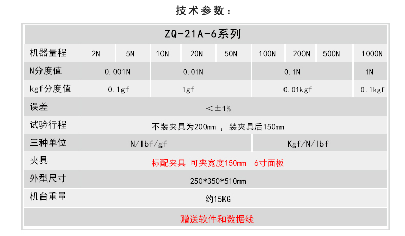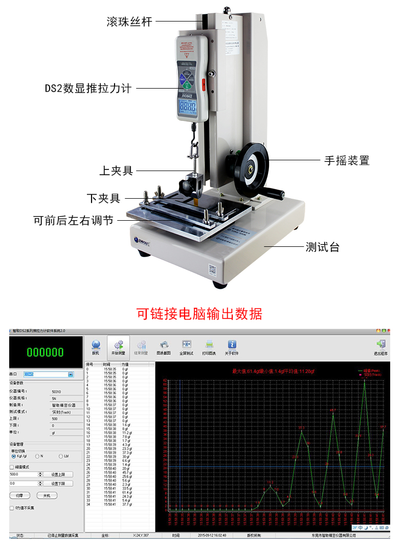 具用于90度拉力測試,同時可選配夾具做垂直180度拉力。該儀器機(jī)械部份采用全封閉結(jié)構(gòu)。機(jī)械傳動系統(tǒng)采用高精度滾珠絲桿與雙直線光桿,轉(zhuǎn)動間隙極小,大大提高測試的精密度。測試時轉(zhuǎn)動手輪使推拉力計上下運(yùn)動,以實現(xiàn)對測試產(chǎn)品的拉伸或壓縮試驗。手輪部份采用杠桿原理設(shè)計,使用起來更輕便省力。力傳感器部份采用智取品牌一代DS2系列推拉力計。誤差可控制在0.5%左右,采樣速率可達(dá)1000次/秒,同時配送軟件和USB數(shù)據(jù)線,可同步把數(shù)據(jù)傳送到電腦,進(jìn)行數(shù)據(jù)保存。 通過轉(zhuǎn)換不同夾具可進(jìn)行,拉伸、壓縮、彎曲、剝離、剪切、撕裂、刺破、等試驗。儀器具有體積小、結(jié)構(gòu)緊湊、穩(wěn)定性高、使用方便等優(yōu)點長期受到廣大用戶的喜愛。(可選配精度0.01MM的位移標(biāo)尺,可以實現(xiàn)力和位移的同步變化,實時顯示拉力或壓力同位移的變化)